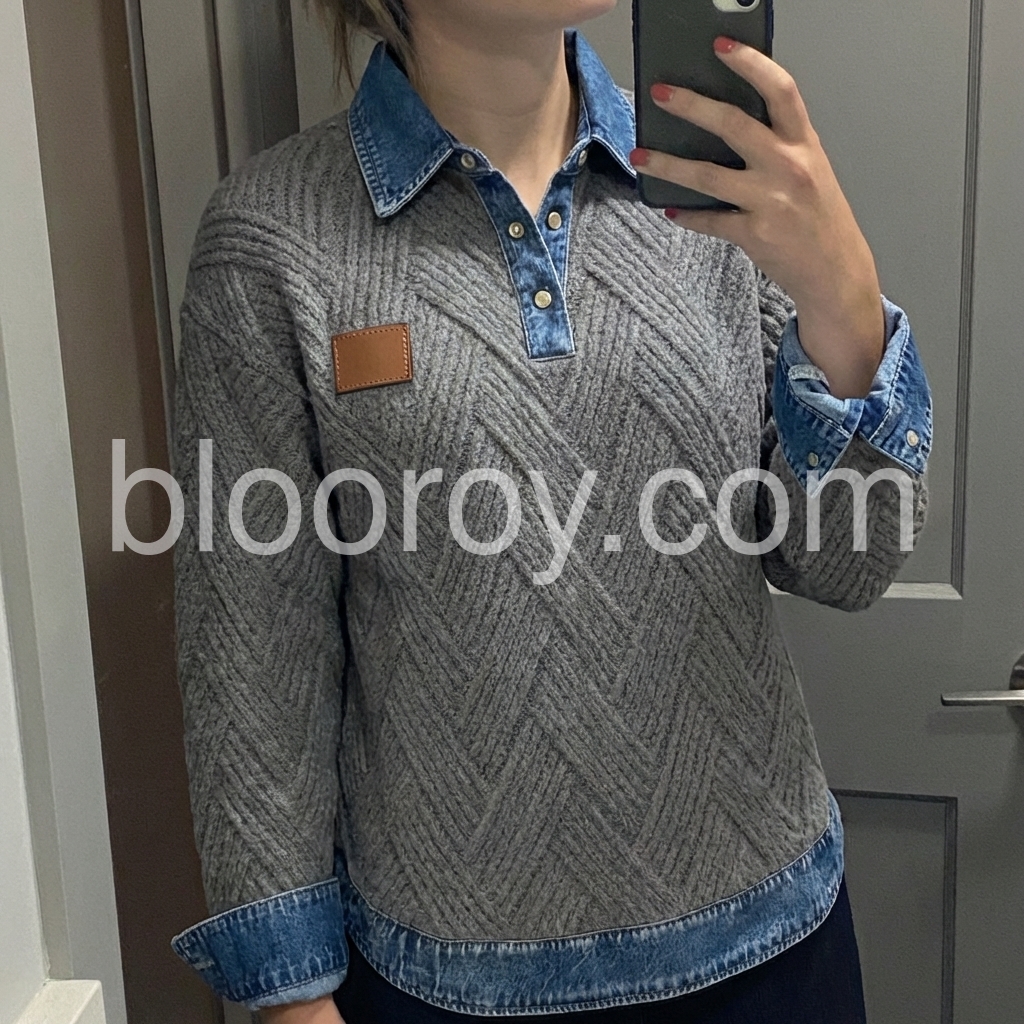 Elevate your casual wardrobe with this sophisticated grey herringbone knit sweater, featuring a distinctive denim collar that bridges the gap between refined knitwear and relaxed styling. The herringbone texture adds visual depth and dimension, while the contrasting denim collar provides a contemporary edge perfect for layering or wearing standalone. Crafted for versatility, this piece transitions seamlessly from weekend wear to smart-casual settings, offering both comfort and polished appeal.