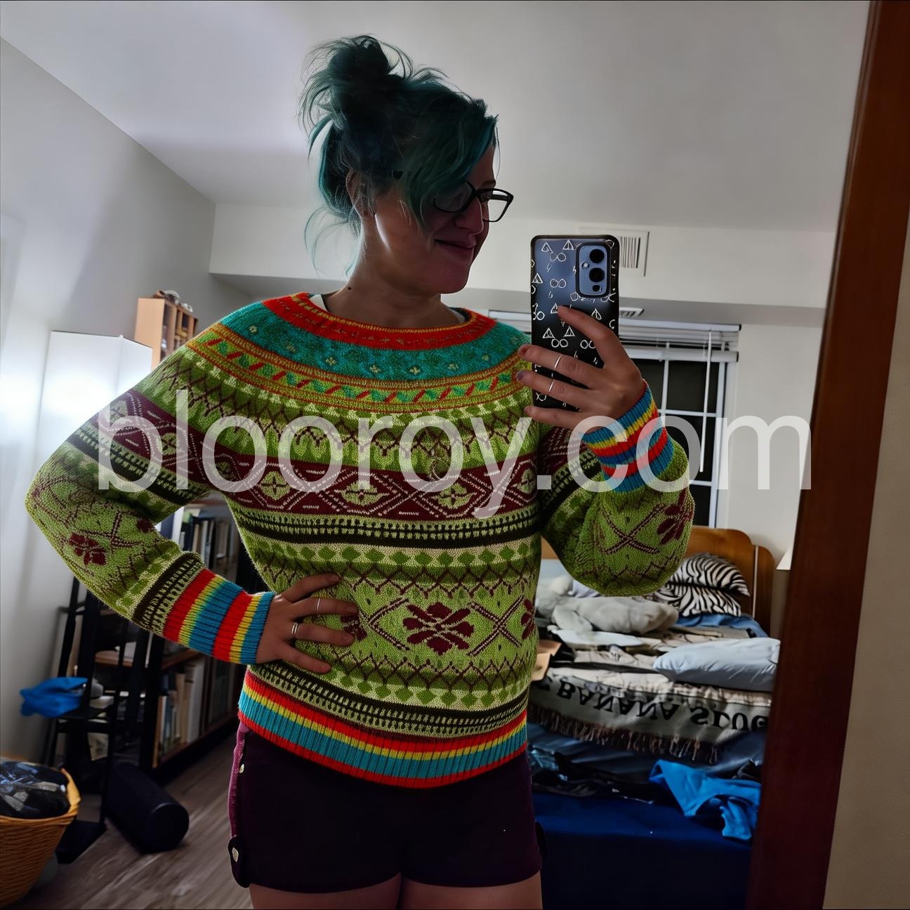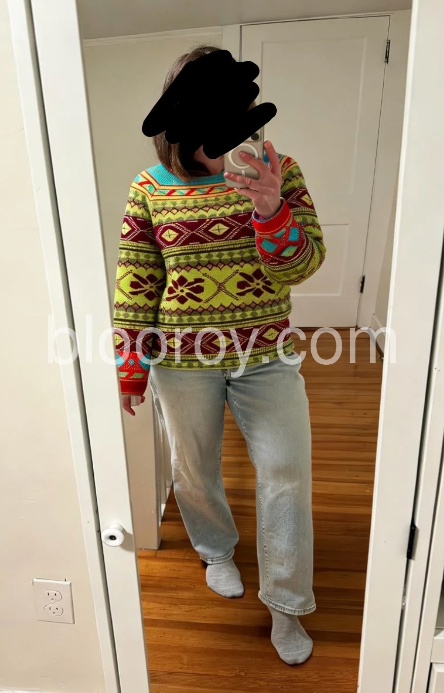 Steal the spotlight in this unique sweater knit in bright shades and a bold stripy pattern. The cozy style has a relaxed fit and pulls on with a wide neckline that shows off your collarbone. Style it with faded straight-leg jeans and combat boots for a 90s-vibe look.