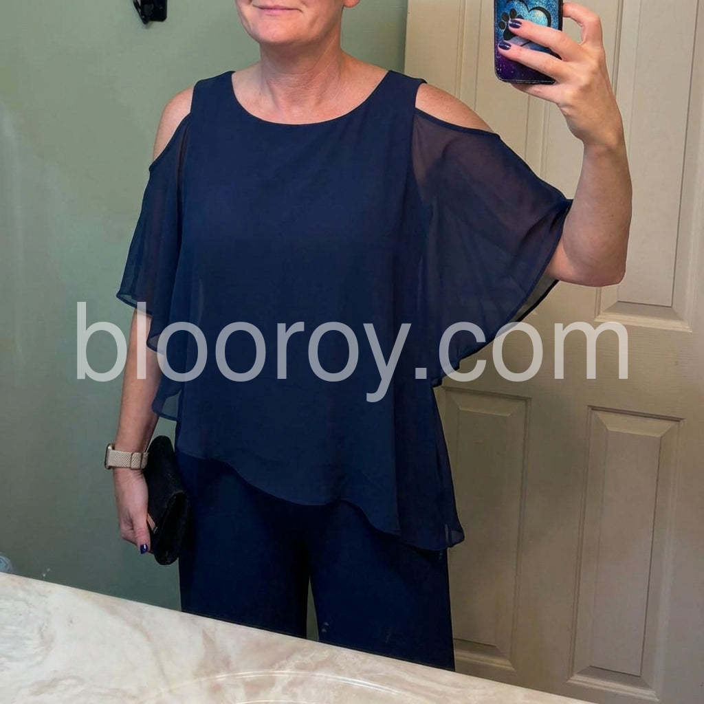 This fashionable two-piece set includes a navy cold shoulder three-quarter length draped sleeves and asymmetrically layered ruffled top and pants. Crafted from lightweight and soft materials, this set is perfect for any occasion. Step up your look with this stylish set.