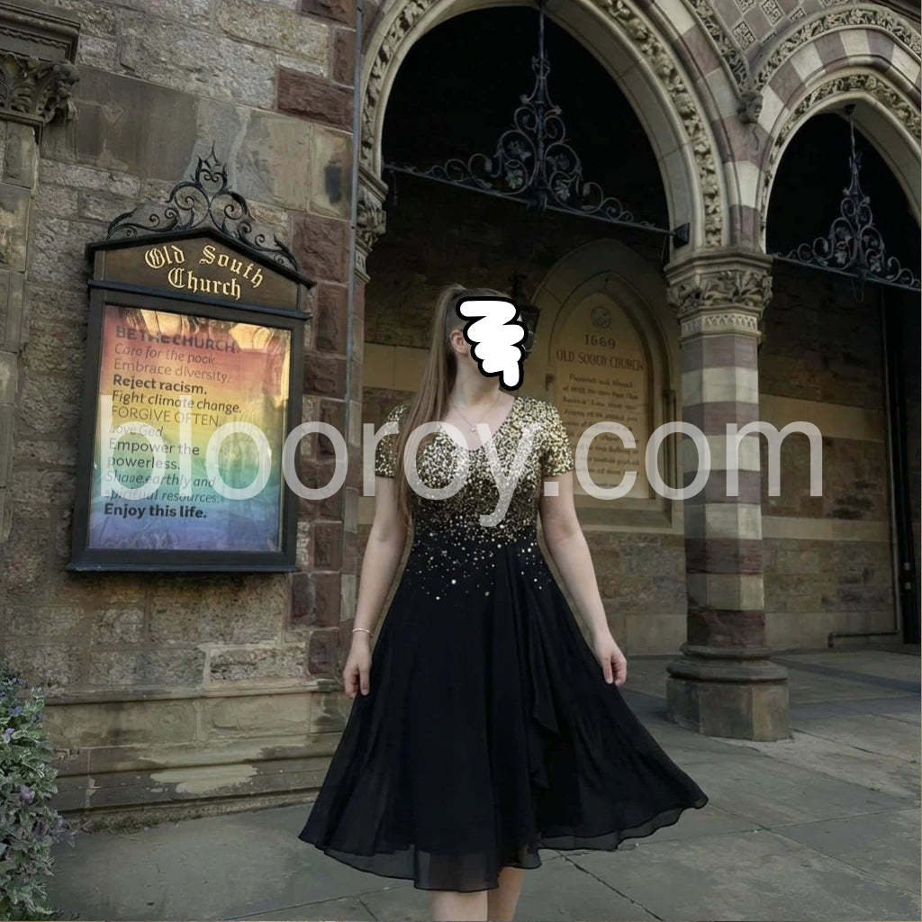 This elegant V-neck midi dress combines sophisticated design with practical comfort. The short sleeves offer versatility for various occasions, while the flattering V-neckline enhances your neckline. The midi length provides a balanced silhouette suitable for both professional settings and social gatherings. Crafted with attention to detail, this stunning dress will become a cornerstone piece in your wardrobe rotation.