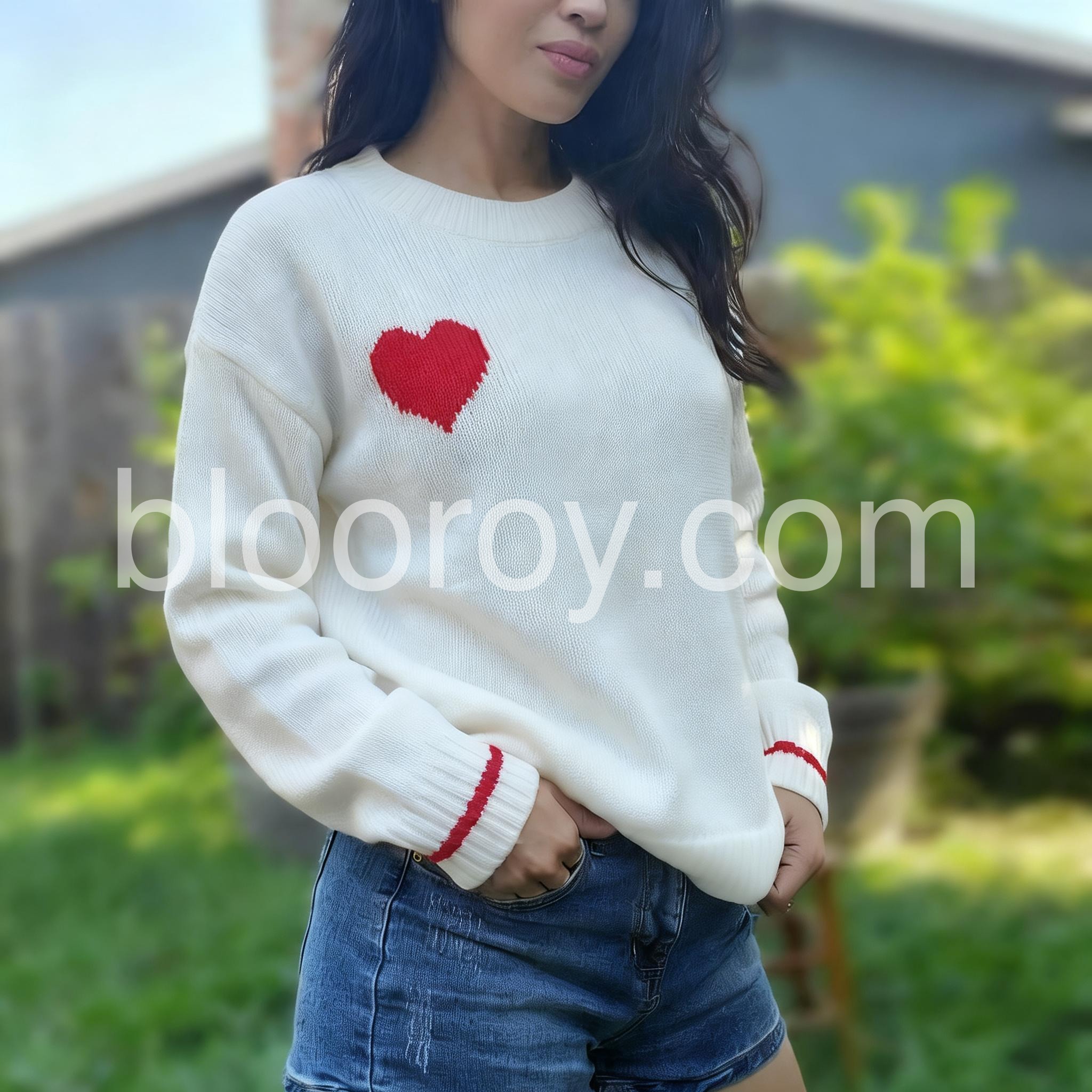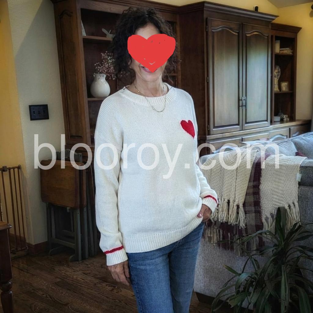 Add love to your everyday style with this chic white sweater. A bright red heart on one side gives it a look of pure romance for anyone and any time, perfect for wearing anywhere. The round collar, cozy long sleeves, and loose fit make it easy to layer, mix and match with jeans and your favorite lightweight jewelry.